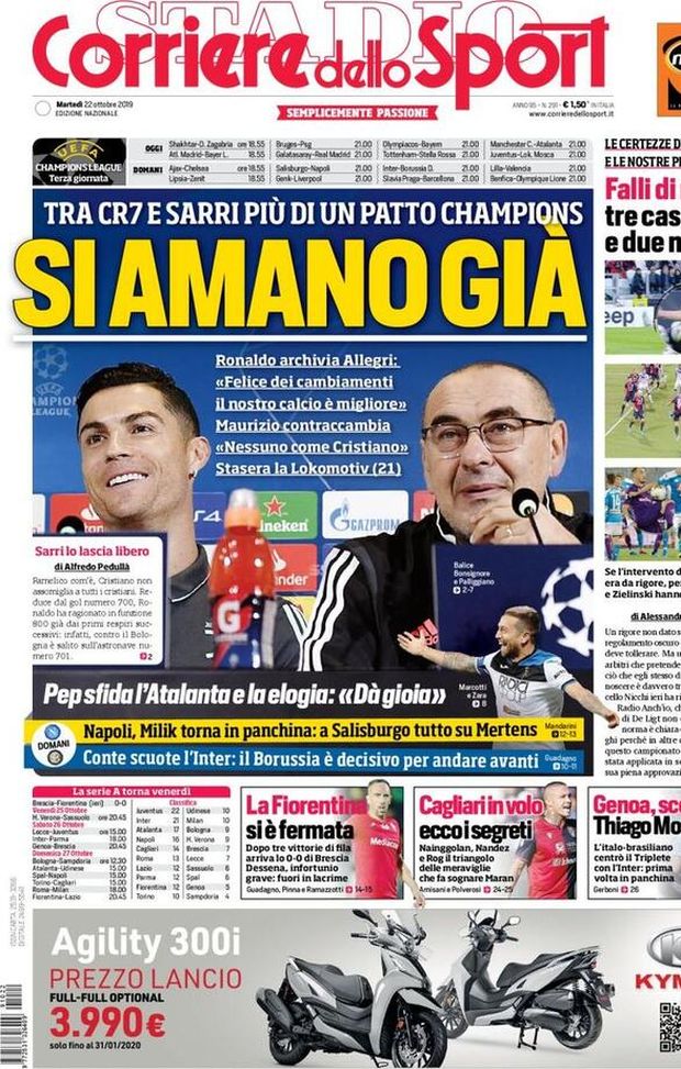 "ULTIME MILAN - Anche il 'Corriere dello Sport', in prima pagina, mette il rapporto, idilliaco, tra Cristiano Ronaldo e Maurizio Sarri in casa Juventus, con il portoghese felice dei cambiamenti alla guida tecnica della 'Vecchia Signora'. In basso, poi, focus Champions League, con il Napoli di Carlo Ancelotti che punterà su Dries Mertens e non su Arkadiusz Milik contro il Salisburgo, con gli elogi di Pep Guardiola, manager del Manchester City, ai prossimi rivali dell'Atalanta e, infine, con lo scossone di Antonio Conte alla sua Inter, che riceverà domani sera a 'San Siro' il Borussia Dortmund. Nel riquadro verticale, un approfondimento di carattere regolamentale sui falli di mano in area di rigore e su come vengono giudicati mentre, nel taglio basso, si parla del pareggio del 'Rigamonti' tra Brescia e Fiorentina, dei segreti del Cagliari in zona Europa League e di Thiago Motta, prossimo tecnico del Genoa.