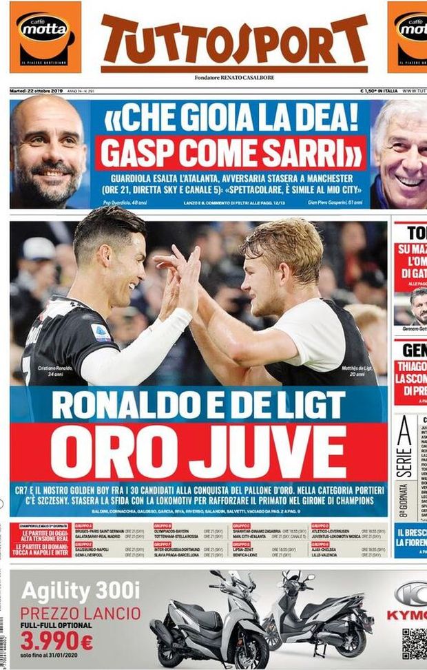 "ULTIME MILAN - Infine, 'Tuttosport' dedica la sua copertina a Cristiano Ronaldo e Matthijs de Ligt, centravanti e difensore centrale della Juventus, tra i 30 candidati alla conquista del Pallone d'Oro 2019. In alto, sotto la testata, le lodi di Pep Guardiola, manager del Manchester City, all'Atalanta di Gian Piero Gasperini, rivale in Champions League all'Etihad. Nel riquadro verticale, infine, si parla di allenatori, con Gennaro Gattuso, ex tecnico del Milan, che insidia la panchina di Walter Mazzarri al Torino mentre sarà l'italo-brasiliano Thiago Motta, ex calciatore del Genoa, a sedere su quella rossoblu al posto di Aurelio Andreazzoli.