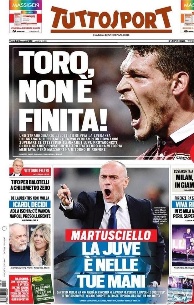 "CALCIOMERCATO MILAN - Infine, 'Tuttosport' oggi in edicola apre con un appello al Torino, quello di non mollare, perché, pur essendo stato sconfitto in casa, 2-3, ieri sera dal Wolverhampton, la qualificazione ai gironi di Europa League è ancora possibile. Quindi, spazio alla Juventus che, almeno nelle prime due gare di campionato contro Parma e Napoli, vedrà sedersi in panchina Giovanni Martusciello, fedelissimo di Maurizio Sarri, messo fuori causa da una polmonite. Nei riquadri laterali, si parla di Napoli, che, pur non lasciando decadere la pista Mauro Icardi, intanto ha bloccato lo svincolato Fernando Llorente per il ruolo di prima punta di peso; di Milan, con l'intervista all'ex difensore Alessandro Costacurta, il quale dimostra di credere molto in Marco Giampaolo e, infine, di Fiorentina, con 15mila spettatori presenti allo stadio 'Franchi' per la prima volta, in assoluto, di Franck Ribéry con indosso la maglia viola.