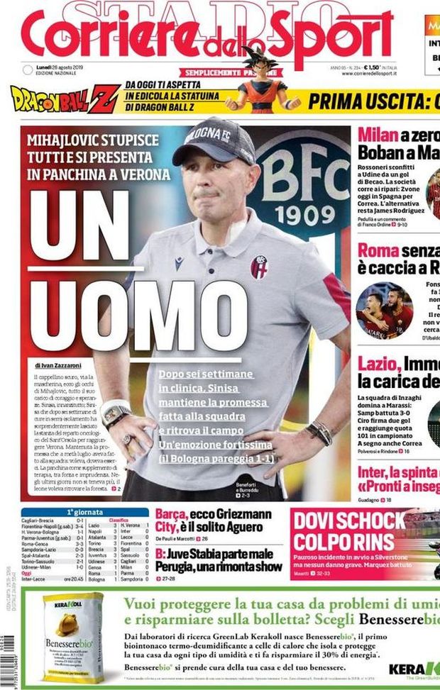 "ULTIME MILAN - Il 'Corriere dello Sport' ha dedicato la sua prima pagina a Sinisa Mihajlovic, il quale, pur sotto chemio per via della leucemia contro la quale sta combattendo, ieri sera era regolarmente in panchina allo stadio 'Bentegodi' di Verona per guidare il suo Bologna contro l'Hellas (risultato finale, 1-1). Nel riquadro verticale, poi, si parla della sconfitta del Milan in casa dell'Udinese e del viaggio di Zvonimir 'Zorro' Boban a Madrid per prendere Ángel Correa e tentare James Rodríguez; del pareggio interno della Roma contro il Genoa, che ha evidenziato le lacune difensive dei giallorossi guidati dal nuovo tecnico Paulo Fonseca; della vittoria esterna della Lazio, passata a 'Marassi' contro la Sampdoria grazie soprattutto ad una doppietta del suo bomber principe, Ciro Immobile, giunto a quota 101 gol in campionato. In Spagna primi acuti, infine, di Antoine Griezmann con la maglia del Barcellona, nel successo al 'Camp Nou' contro il Betis.