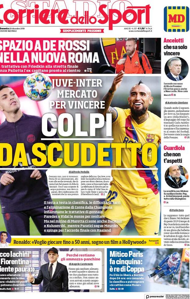 "CALCIOMERCATO MILAN - Il 'Corriere dello Sport', invece, dà spazio, in copertina, al duello Scudetto tra Juventus e Inter, appaiate in testa alla classifica del campionato e pronte ad ingaggiare un nuovo centrocampista nella sessione invernale di calciomercato: Leandro Paredes i bianconeri, Arturo Vidal i nerazzurri. In alto, sotto la testata, la suggestione del clamoroso ritorno di Daniele De Rossi alla Roma qualora la società passi da James Pallotta al gruppo Friedkin. Il quotidiano romano, quindi, fornisce la ribalta agli allenatori: Carlo Ancelotti, 2 vittorie in 2 gare con l'Everton; Pep Guardiola, con il suo Manchester City che non sta brillando in Premier League e ha già abdicato il titolo e, infine, Giuseppe Iachini, presentato ieri come nuovo tecnico della Fiorentina.