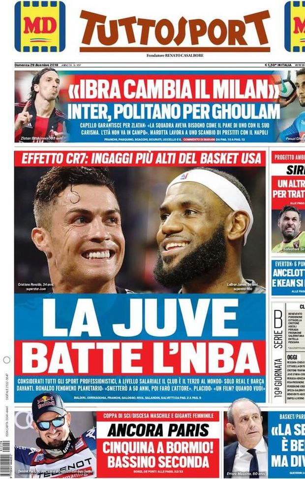 "CALCIOMERCATO MILAN - Infine, 'Tuttosport' dedica la sua prima pagina alla Juventus, che, per stipendi, è il terzo club al mondo, dopo Real Madrid e Barcellona, considerati tutti gli sport professionistici, NBA inclusa. Il fenomeno planetario ed il giocatore più pagato? Logicamente, Cristiano Ronaldo. In alto, sotto la testata, l'intervista a Fabio Capello, che ha assicurato come Zlatan Ibrahimovic possa cambiare il Milan e le manovre di mercato di Napoli e Inter, pronte a scambiarsi Faouzi Ghoulam e Matteo Politano. Quindi, dopo il richiamo al grande impatto di Carlo Ancelotti nell'Everton, con 6 punti in 2 gare, il capitolo Torino: il portiere Salvatore Sirigu potrà essere confermato e blindato soltanto con un progetto molto ambizioso.