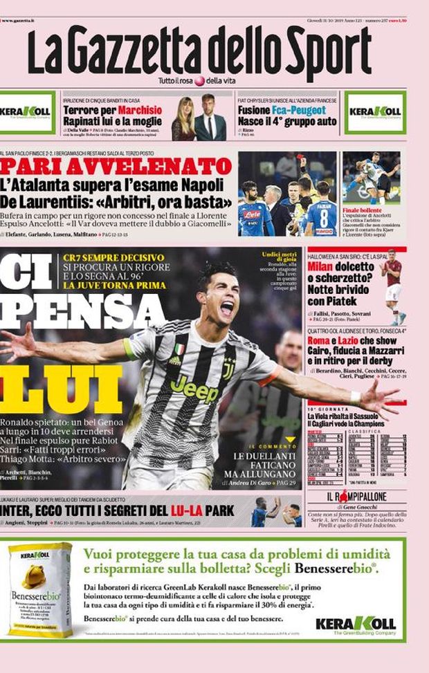 "NEWS MILAN - 'La Gazzetta dello Sport' oggi in edicola riserva la sua copertina a Cristiano Ronaldo, che, dopo essersi visto annullare un gol in pieno recupero, si è conquistato un calcio di rigore e lo ha trasformato al 96' per decidere, con il gol del 2-1, Juventus-Genoa. I bianconeri di Maurizio Sarri, così, restano primi in classifica con un punto di vantaggio sull'Inter. Sopra l'immagine dell'esultanza di CR7, lo sfogo di Aurelio De Laurentiis, Presidente del Napoli, per come è maturato il 2-2 del 'San Paolo' contro l'Atalanta (espulso persino Carlo Ancelotti per rimostranze contro l'arbitro) e, sotto, tutti i segreti della coppia Romelu Lukaku - Lautaro Martínez in casa nerazzurra. Nel riquadro laterale della 'rosea', poi, spazio a Milan-Spal di questa sera, con il tecnico rossonero Stefano Pioli che si prepara a rilanciare Krzysztof Piatek ed ai commenti su Lazio-Torino 4-0 e Udinese-Roma 0-4. Urbano Cairo, Presidente granata, dà fiducia (a tempo) al tecnico Walter Mazzarri in vista del Derby della Mole.