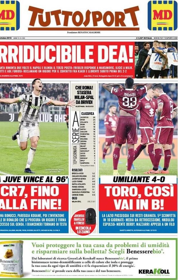 "NEWS MILAN - Infine, 'Tuttosport', dopo aver dedicato lo spazio in alto, sotto la testata, all'Atalanta di Gian Piero Gasperini, uscita imbattuta (non senza polemiche e veleni nei confronti dell'arbitro ...) anche dal 'San Paolo' di Napoli (2-2), alla Juventus, che ha battuto il Genoa in casa per 2-1, in pieno recupero, con un calcio di rigore realizzato da Cristiano Ronaldo ed al Torino di Walter Mazzarri, umiliato allo stadio 'Olimpico' di Roma (0-4) dalla Lazio. Quinta sconfitta in dieci giornate, media da retrocessione per i granata ed il tecnico livornese, ora, rischia seriamente il posto in panchina.