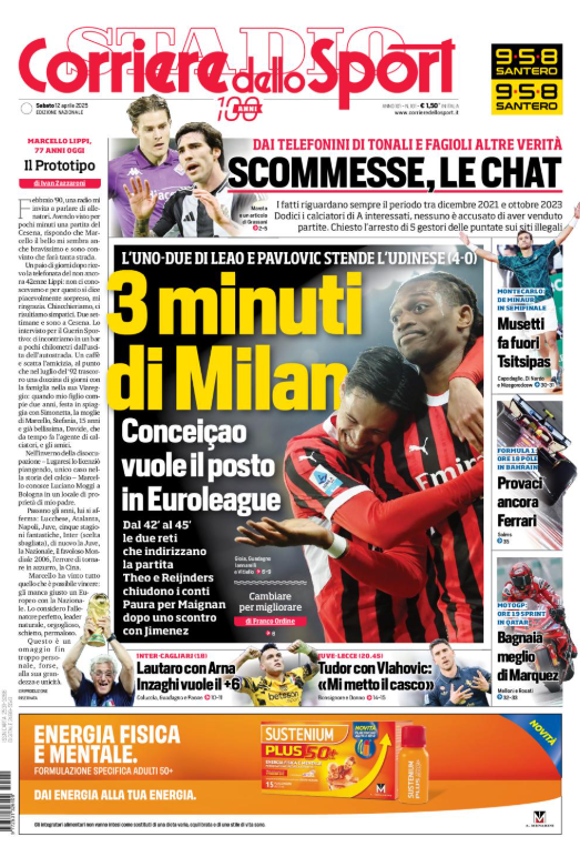 Questa è la prima pagina del 'Corriere dello Sport', in edicola oggi, sabato 12 aprile 2025. Diamo un’occhiata alle principali novità sul mondo dello sport e in particolare del calcio, cercando di evidenziare le notizie sul Milan.