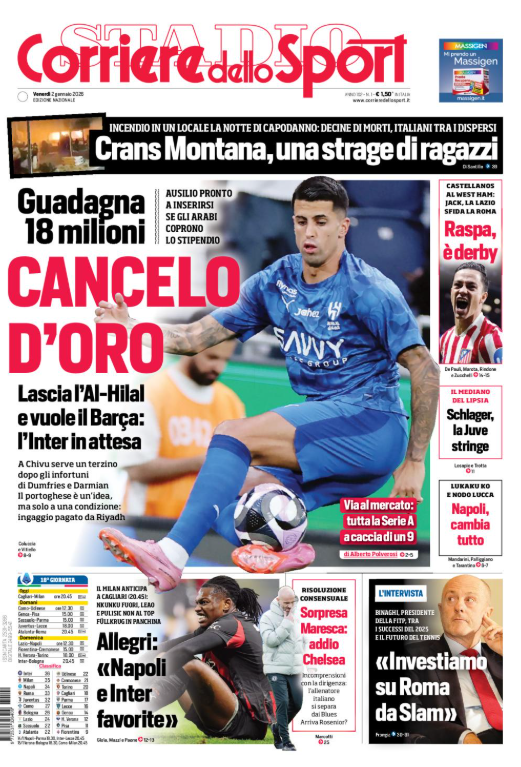 La prima pagina del 'Corriere dello Sport' apre con Cancelo: voglia di Barcellona, ma l'Inter attende. Per Raspadori è derby tra Roma e Lazio. Napoli cambia tutto. Allegri: "Napoli e Inter favorite". Ecco la prima pagina del 'Corriere dello Sport'.