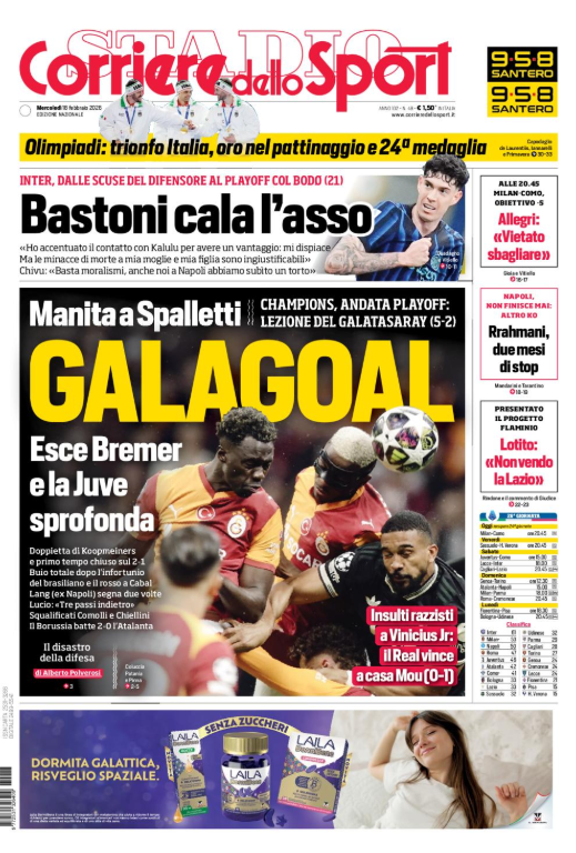 La prima pagina del 'Corriere dello Sport' apre con il crollo della Juventus in Champions League contro il Galatasaray. Bastoni cala l'asso. Allegri: "Vietato sbagliare". Rrahamani due mesi di stop. Ecco la prima pagina del 'Corriere dello Sport'.