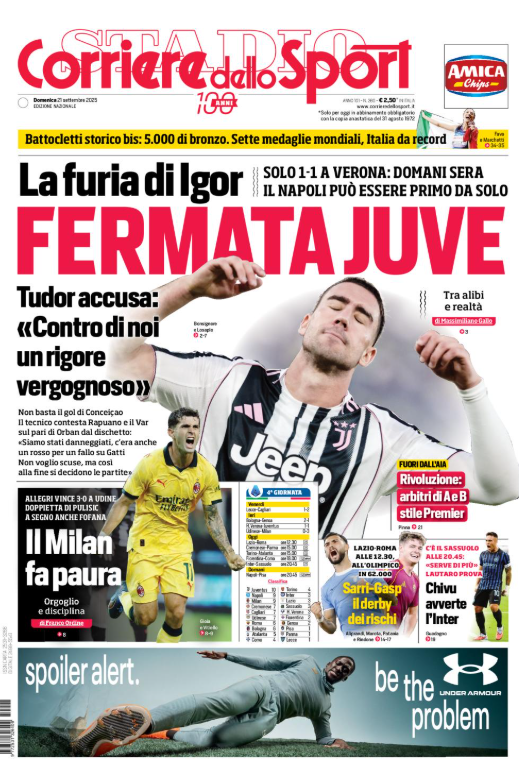 Questa è la prima pagina di 'Corriere dello Sport', in edicola oggi, domenica 21 settembre 2025. Diamo un’occhiata alle principali novità sul mondo dello sport e in particolare del calcio, cercando di evidenziare le notizie sul Milan.
