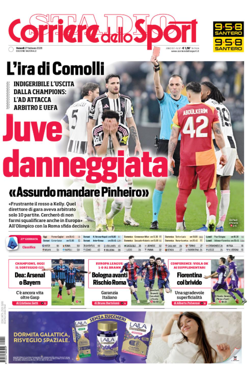 La prima pagina del 'Corriere dello Sport' apre con l'ira di Comolli. Juve danneggiata. Dea: Arsenal o Bayern Monaco. Bologna avanti, rischio Roma. Fiorentina con brivido. Ecco la prima pagina del 'Corriere dello Sport'.
