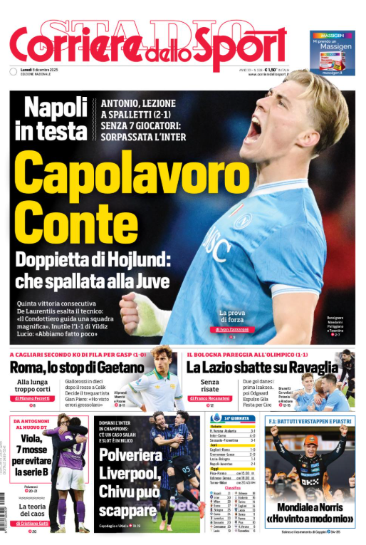 Questa è la prima pagina di 'Corriere dello Sport', in edicola oggi, lunedì 8 dicembre 2025. Diamo un’occhiata alle principali novità sul mondo dello sport e in particolare del calcio, cercando di evidenziare le notizie sul Milan.