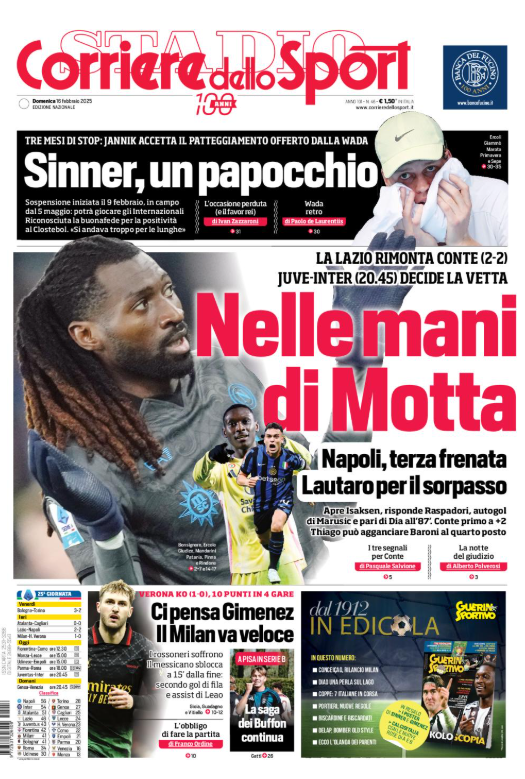 Questa è la prima pagina del 'Corriere dello Sport', in edicola oggi, domenica 16 febbraio 2025. Diamo un’occhiata alle principali novità sul mondo dello sport e in particolare del calcio, cercando di evidenziare le notizie sul Milan.