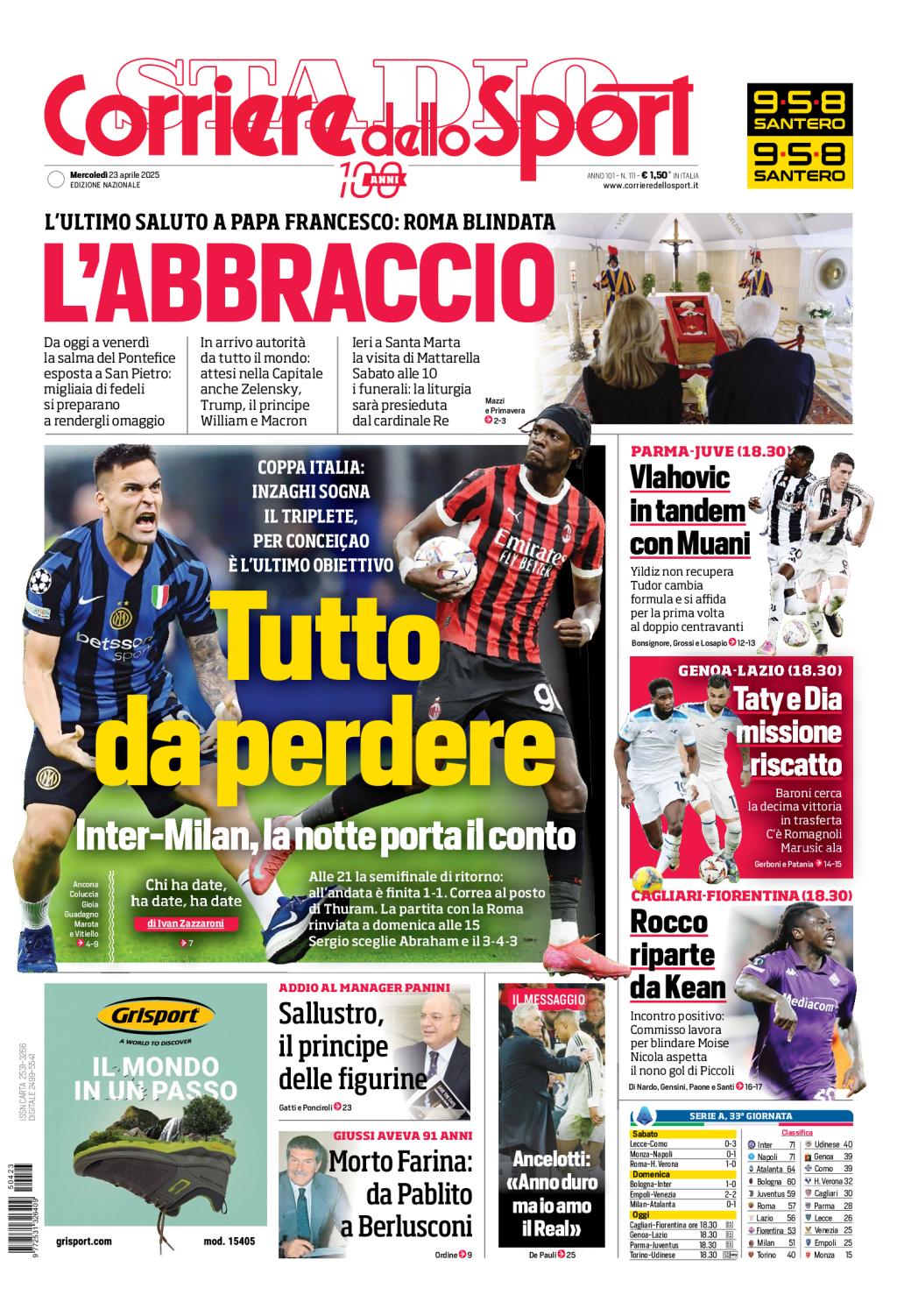Oggi, però, si recuperano anche le quattro partite di Serie A che non si sono disputate il lunedì di Pasquetta per la scomparsa di Papa Francesco (funerali sabato 26 aprile alle ore 10:00 a San Pietro per il Pontefice, di cui il quotidiano romano parla sotto la testata). Tutti in campo alle ore 18:30, in contemporanea.