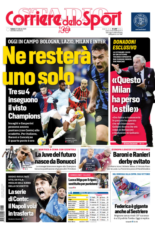 Questa è la prima pagina del 'Corriere dello Sport', in edicola oggi, sabato 22 febbraio 2025. Diamo un’occhiata alle principali novità sul mondo dello sport e in particolare del calcio, cercando di evidenziare le notizie sul Milan.