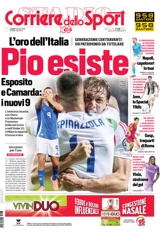 La prima pagina del 'Corriere dello Sport' apre con l'oro dell'Italia. Pio esiste. Esposito e Camarda: i nuovi 9 dell'Italia. Napoli capolavori in tour. Juventus, lo special Yildiz. Gasperini trequarti di Roma. Viola sindrome del gol. Ecco la prima pagina del 'Corriere dello Sport'.