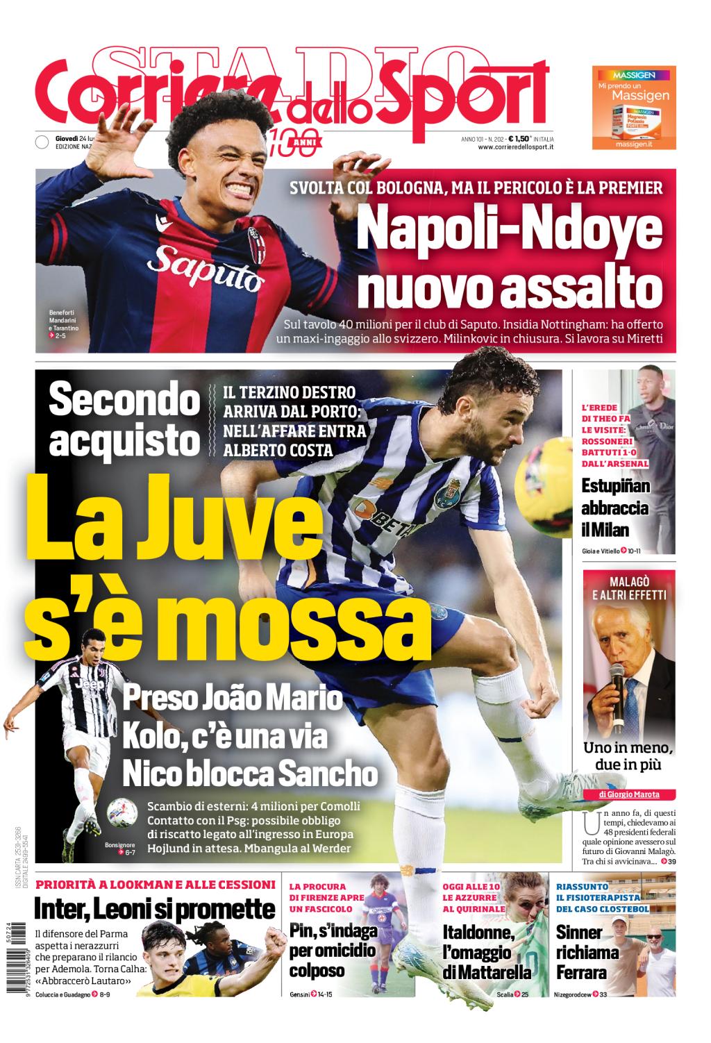 In alto, sotto la testata, si parla del Napoli. In chiusura l'arrivo del portiere Vanja Milinković-Savić dal Torino, assalto a Fabio Miretti della Juve e attenzione a Dan Ndoye: pronti 40 milioni di euro per convincere il Bologna, con lo svizzero che sembrava già ad un passo dal Nottingham Forest. In casa Inter, priorità all'operazione per Ademola Lookman con l'Atalanta e alle cessioni. Poi, verrà il tempo di Giovanni Leoni, promesso sposo nerazzurro.