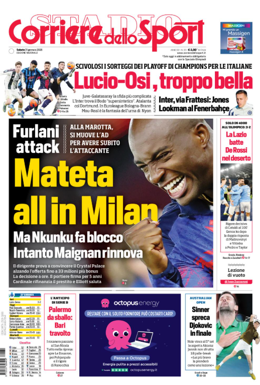 PIANETAMILAN news milan rassegna stampa Prima pagina Corriere dello Sport: “Furlani attack. Mateta all in Milan”
