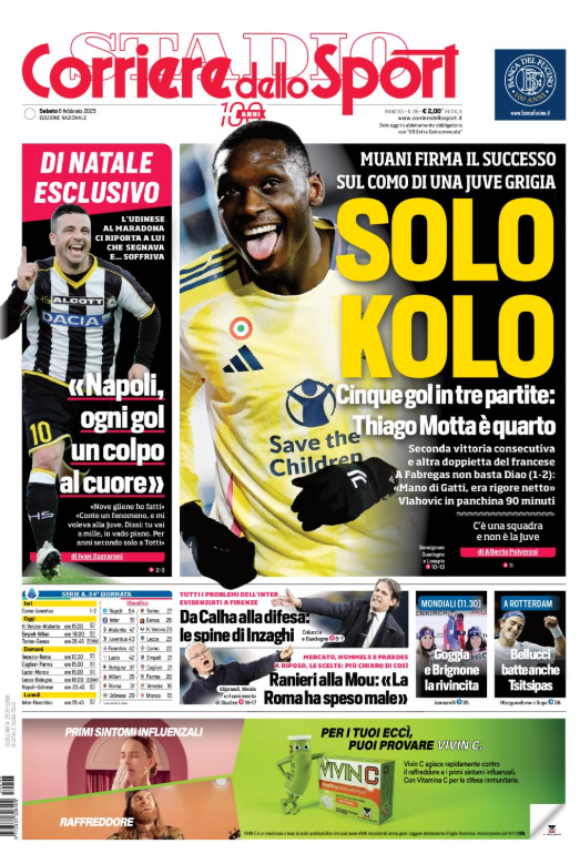 La prima pagina del 'Corriere dello Sport' apre con la Serie A. Solo Kolo. Muani firma il successo sul Como di una Juventus grigia. Intervista a Di Natale. Da Calha alla difesa: le spine di Inzaghi. Ranieri alla Mou: "La Roma ha speso male". Ecco la prima pagina del 'Corriere dello Sport'.