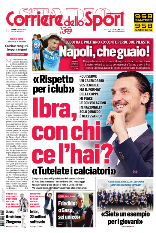 Questa è la prima pagina di 'Corriere dello Sport', in edicola oggi, giovedì 9 ottobre 2025. Diamo un’occhiata alle principali novità sul mondo dello sport e in particolare del calcio, cercando di evidenziare le notizie sul Milan.