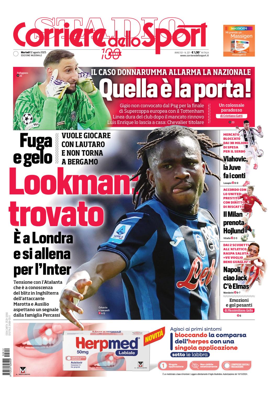 In alto, sotto la testata, il caso Gianluigi Donnarumma. Il portiere italiano, in scadenza di contratto con il PSG, non è stato convocato per la finale della Supercoppa Europea contro il Tottenham di domani sera a Udine. È sul mercato, anche perché il titolare tra i pali della porta dei parigini sarà il nuovo arrivato Lucas Chevalier.