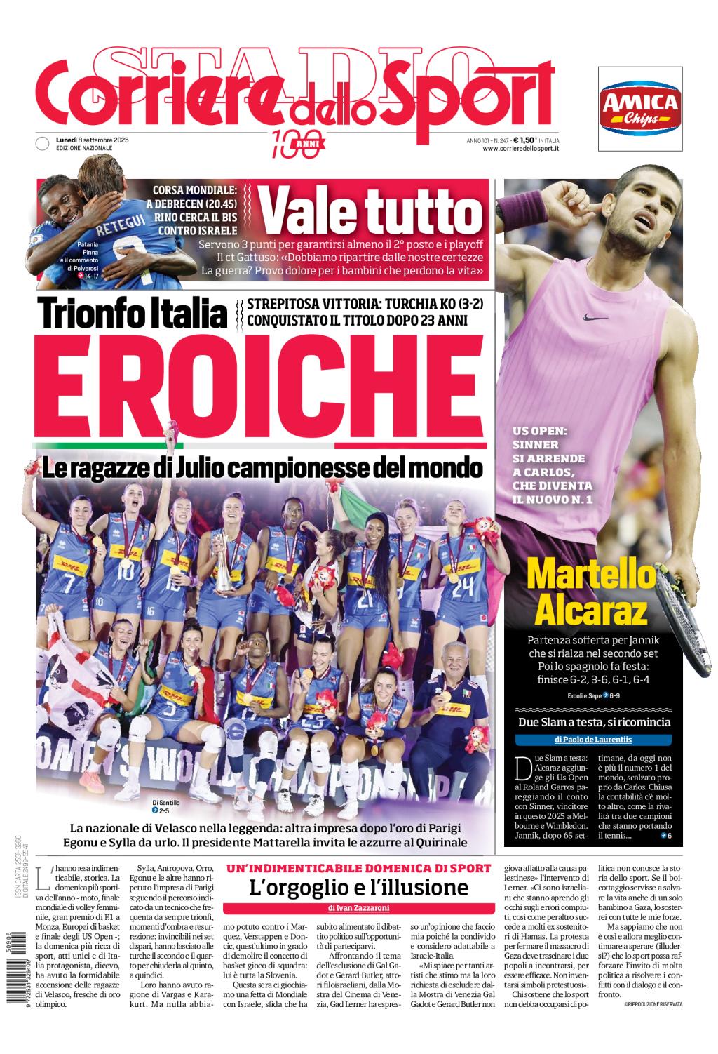 Il calcio, poi, a chiudere il cerchio sulla copertina del quotidiano romano. Alle ore 20:45, infatti, si disputerà a Debrecen (Ungheria), quindi in campo neutro, la sfida Israele-Italia, valida per le qualificazioni ai Mondiali 2026. Agli Azzurri del Commissario Tecnico Gennaro Gattuso servono tre punti per garantirsi almeno il secondo posto nel girone e i playoff.