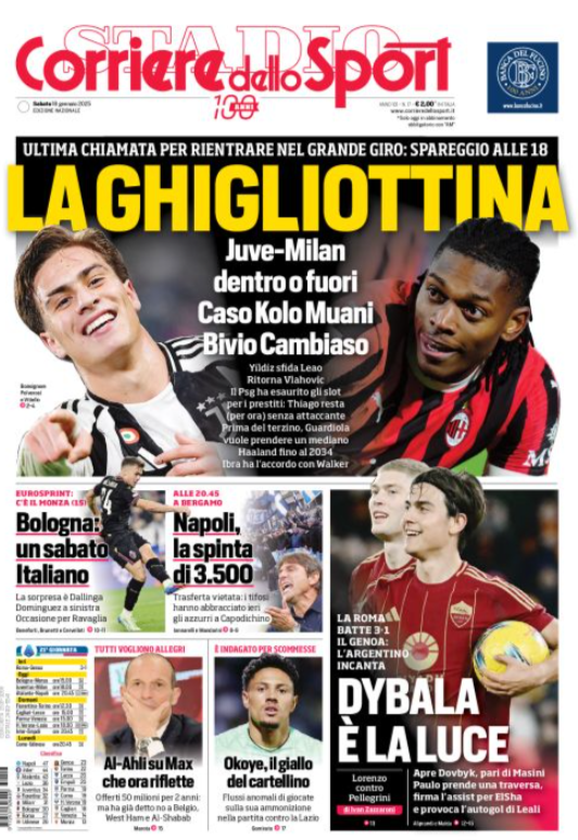 La prima pagina del 'Corriere dello Sport' apre con Juventus-Milan. Ultima chiamata per rientrare nel grande giro: spareggio alle 18. La ghigliottina. Juventus-Milan dentro o fuori. Bologna un sabato italiano. Napoli, la spinta di 3500. Roma, la luce di Dybala. Okoye e il giallo del cartellino. Allegri verso l'Arabia. Ecco la prima pagina del 'Corriere dello Sport'.