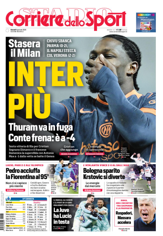 Questa è la prima pagina di 'Corriere dello Sport', in edicola oggi, giovedì 8 gennaio 2026. Diamo un’occhiata alle principali novità sul mondo dello sport e in particolare del calcio, cercando di evidenziare le notizie sul Milan.