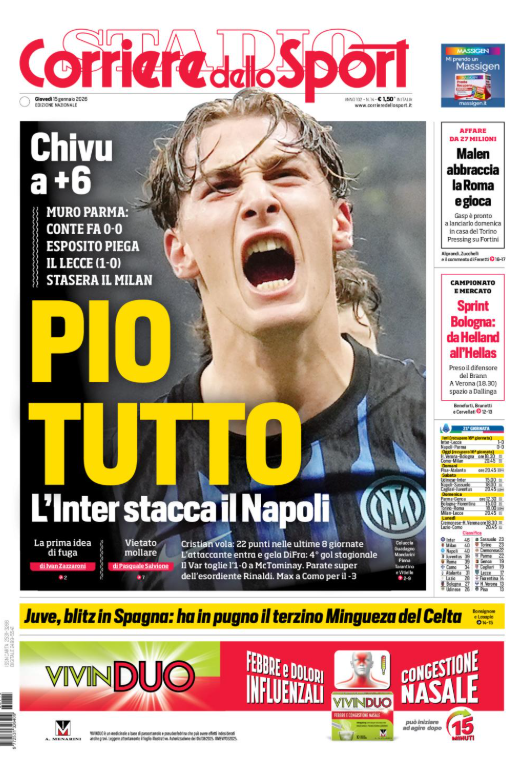 La prima pagina del 'Corriere dello Sport' apre con la Serie A: Pio tutto. L'Inter vince contro il Lecce, il Napoli frena col Parma. Malen abbraccia le Roma e gioca. Sprint Bologna: da Helland all'Hellas. La Juventus ha in pugno Mingueza. Ecco la prima pagina del 'Corriere dello Sport'.