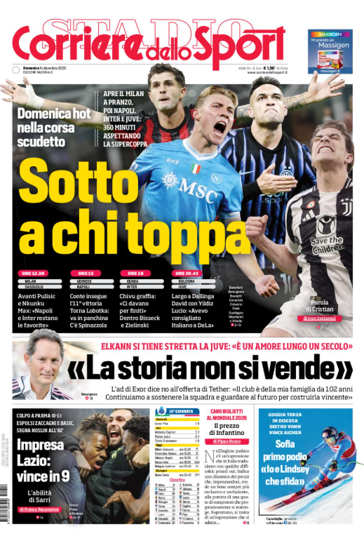 Questa è la prima pagina di 'Corriere dello Sport', in edicola oggi, domenica 14 dicembre 2025. Diamo un’occhiata alle principali novità sul mondo dello sport e in particolare del calcio, cercando di evidenziare le notizie sul Milan.
