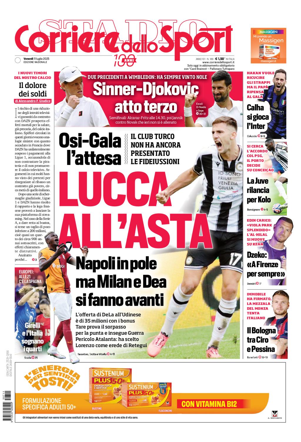 Il 'Corriere dello Sport' si apre con il calciomercato del Napoli, tra il dubbio Victor Osimhen, che nemmeno il Galatasaray sembra voler prendere a quelle cifre, e l'interesse per Lorenzo Lucca, su cui c'è anche il Milan. Spazio, però, anche a Jannik Sinner, che nella giornata odierna affronterà Novak Djokovic nella semifinale di Wimbledon 2025. Si parla però anche di Fiorentina, Bologna ed Inter.