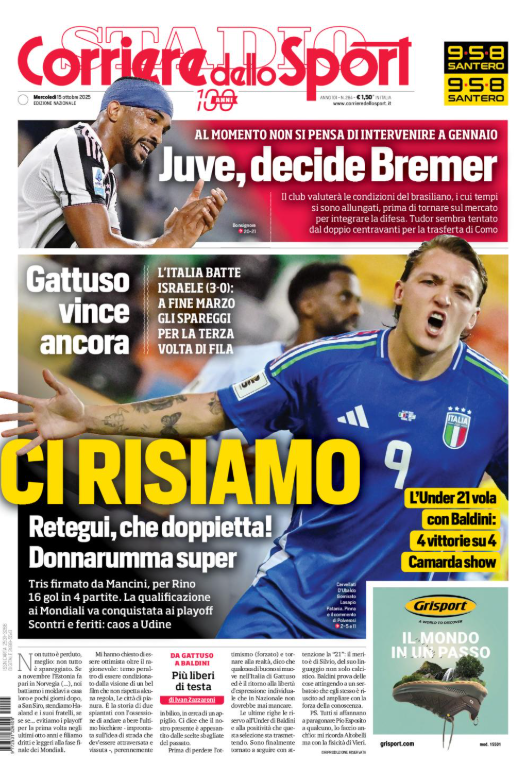 Questa è la prima pagina di 'Corriere dello Sport', in edicola oggi, mercoledì 15 ottobre 2025. Diamo un’occhiata alle principali novità sul mondo dello sport e in particolare del calcio, cercando di evidenziare le notizie sul Milan.
