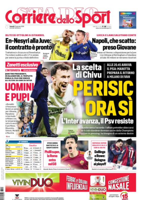 La prima pagina del 'Corriere dello Sport' apre con il mercato dell'Inter. La scelta di Chivu. Perisic ora si. En-Nesyri alla Juve: contratto pronto. Napoli che scatto: preso Giovane. Bene Roma e Bologna in Europa League. Ecco la prima pagina del 'Corriere dello Sport'.