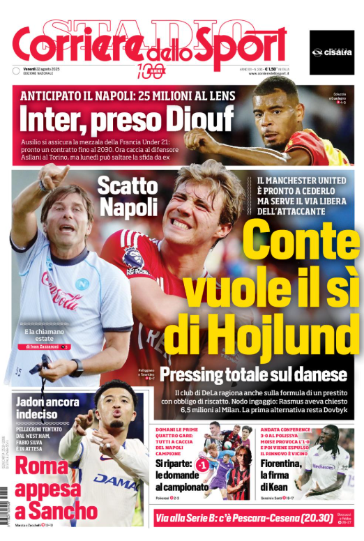 La prima pagina del 'Corriere dello Sport' apre con il Napoli. Scatto per Hojlund. Roma appesa a Sancho. Fiorentina la firma di Kean in Conference. Si riparte! Le domande al campionato. Inter preso Diouf. Ecco la prima pagina del 'Corriere dello Sport'.