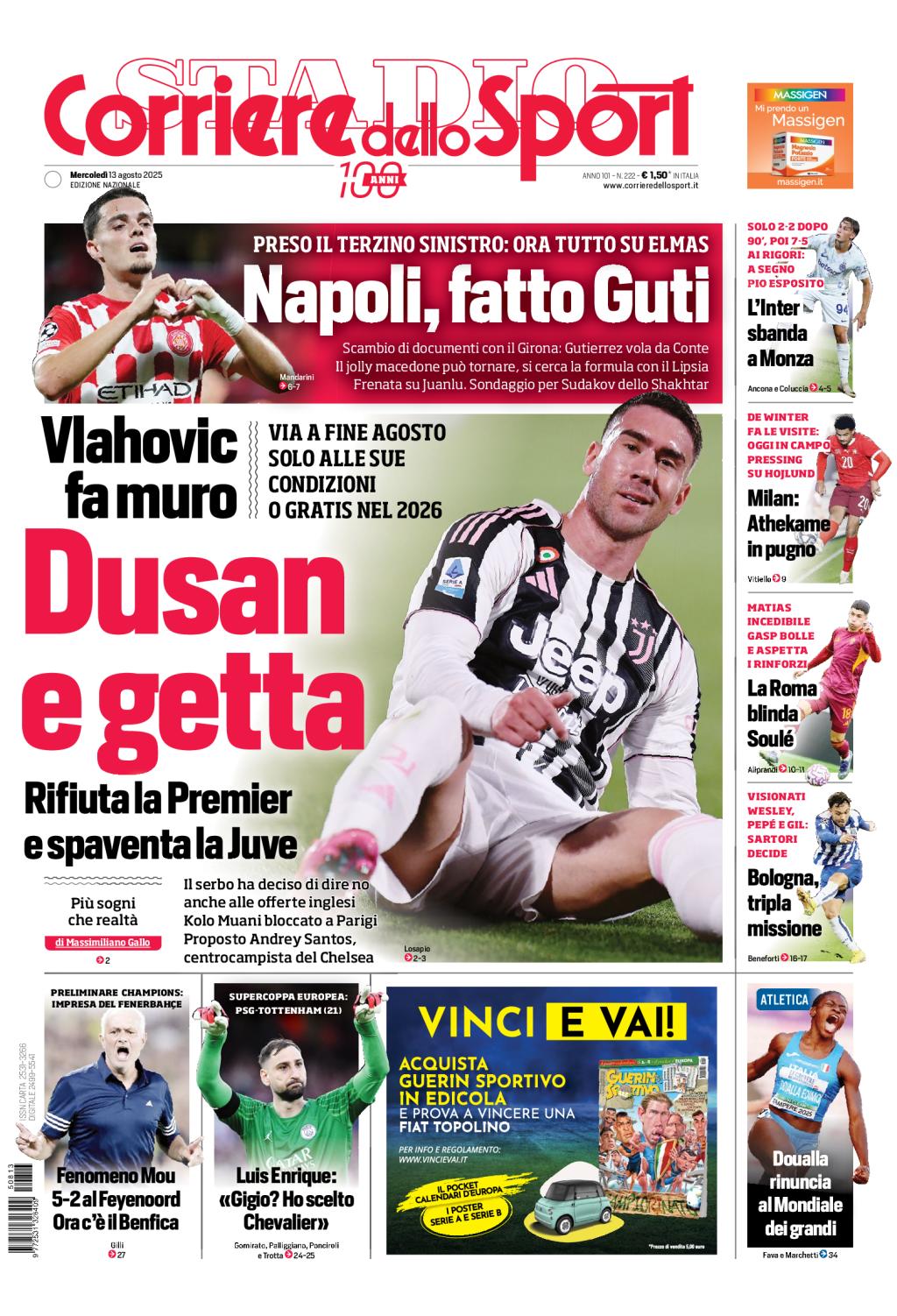 In alto, sotto la testata, il calciomercato del Napoli: preso Miguel Gutiérrez dal Girona, ora tutto sul ritorno di Eljif Elmas dal RB Lipsia. Frenata per il terzino destro Juanlu Sánchez del Siviglia, sondaggio per Heorhij Sudakov dello Shakhtar Donetsk. Il Milan prende Koni De Winter dal Genoa, ha in pugno Zachary Athekame dello Young Boys e va in pressing su Rasmus Højlund del Manchester United.