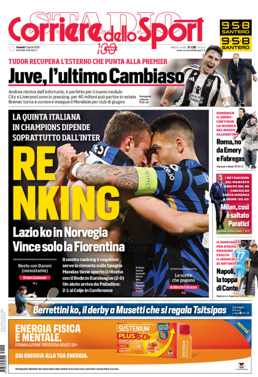 Questa è la prima pagina del 'Corriere dello Sport', in edicola oggi, venerdì 11 aprile 2025. Diamo un’occhiata alle principali novità sul mondo dello sport e in particolare del calcio, cercando di evidenziare le notizie sul Milan.