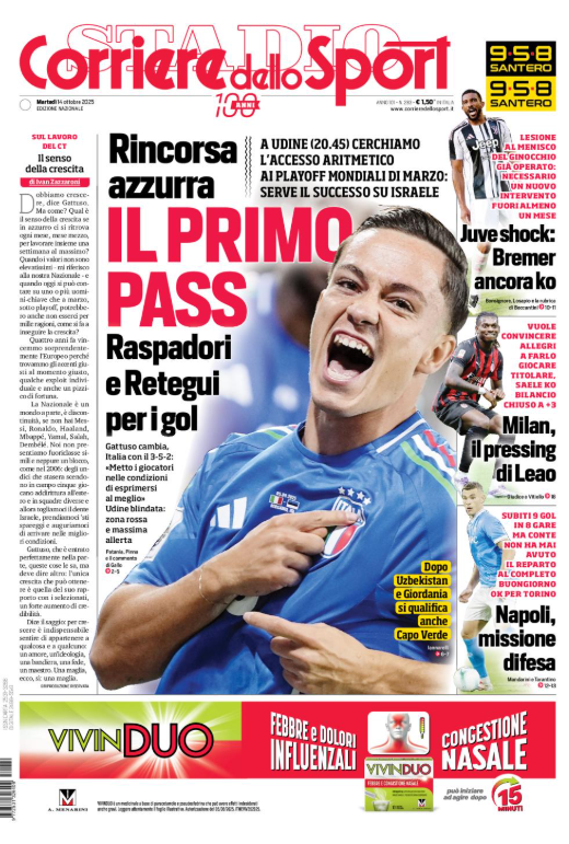 Questa è la prima pagina di 'Corriere dello Sport', in edicola oggi, martedì 14 ottobre 2025. Diamo un’occhiata alle principali novità sul mondo dello sport e in particolare del calcio, cercando di evidenziare le notizie sul Milan.