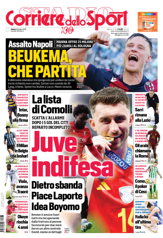 La prima pagina del 'Corriere dello Sport' apre con il calciomercato. Juventus indifesa. Piace Laporte. Idea Boyomo. Inter, Bonny alla firma. Viola, avanza Traoré. Il poker del Como di Fabregas. Il Milan in Belgio per Jashari. Sarri rimane alla Lazio. Gli arabi chiamano la Roma. Okoye rischia 4 anni. Ecco la prima pagina del 'Corriere dello Sport'.