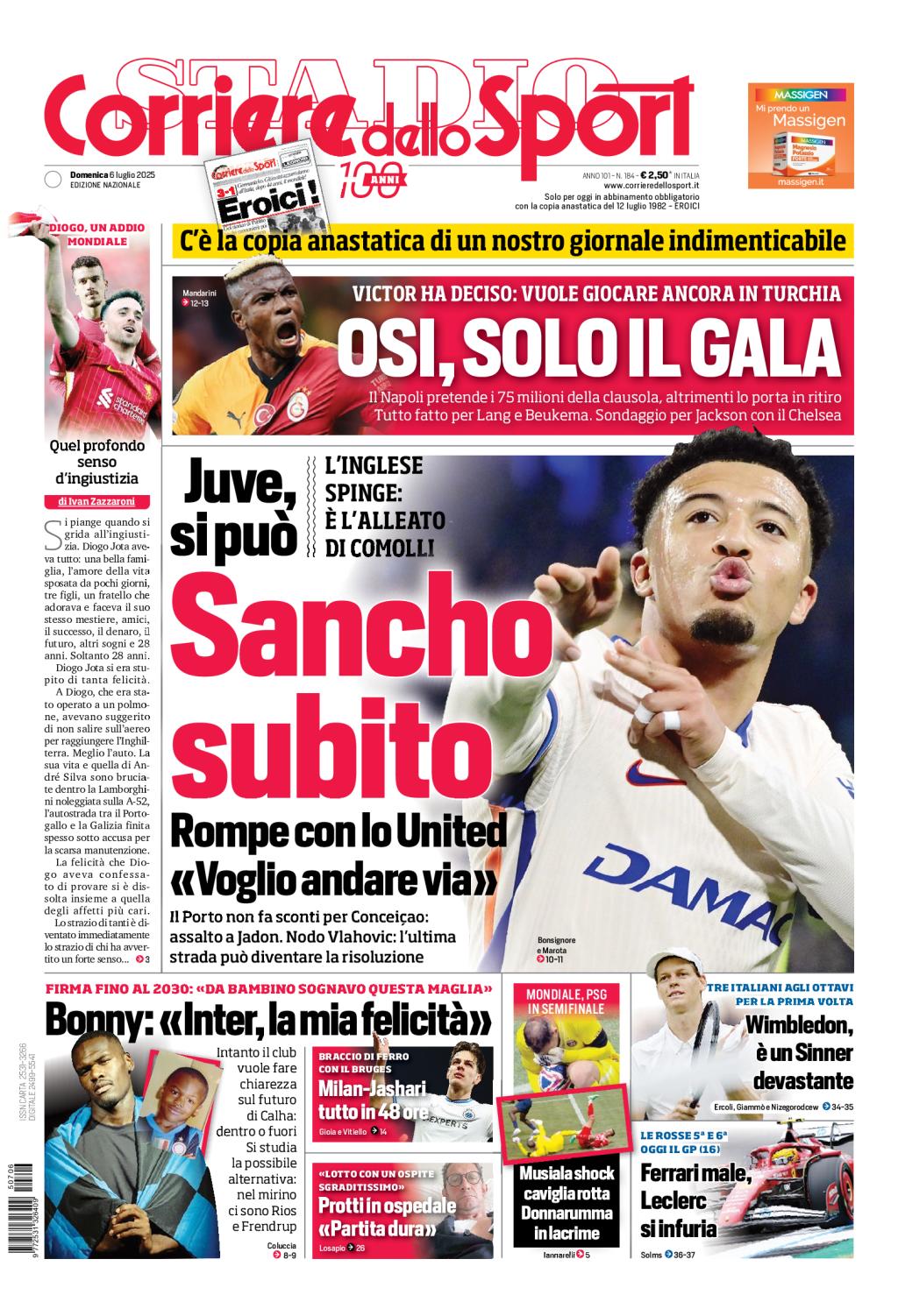 In alto, sotto la testata, si parla del Napoli. Il centravanti nigeriano Victor Osimhen ha deciso: vuole restare in Turchia per giocare ancora nel Galatasaray. Il club campano, che intanto chiude per Noa Lang (PSV Eindhoven) e Sam Beukema (Bologna) e pensa a Nicholas Jackson (Chelsea), pretende il pagamento dei 75 milioni di euro della clausola risolutoria. Altrimenti, porterà in ritiro l'attaccante.