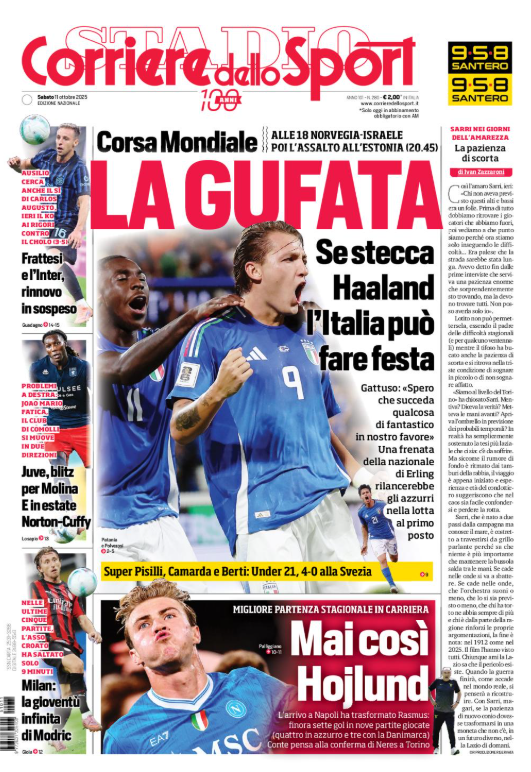 Questa è la prima pagina di 'Corriere dello Sport', in edicola oggi, sabato 11 ottobre 2025. Diamo un’occhiata alle principali novità sul mondo dello sport e in particolare del calcio, cercando di evidenziare le notizie sul Milan.