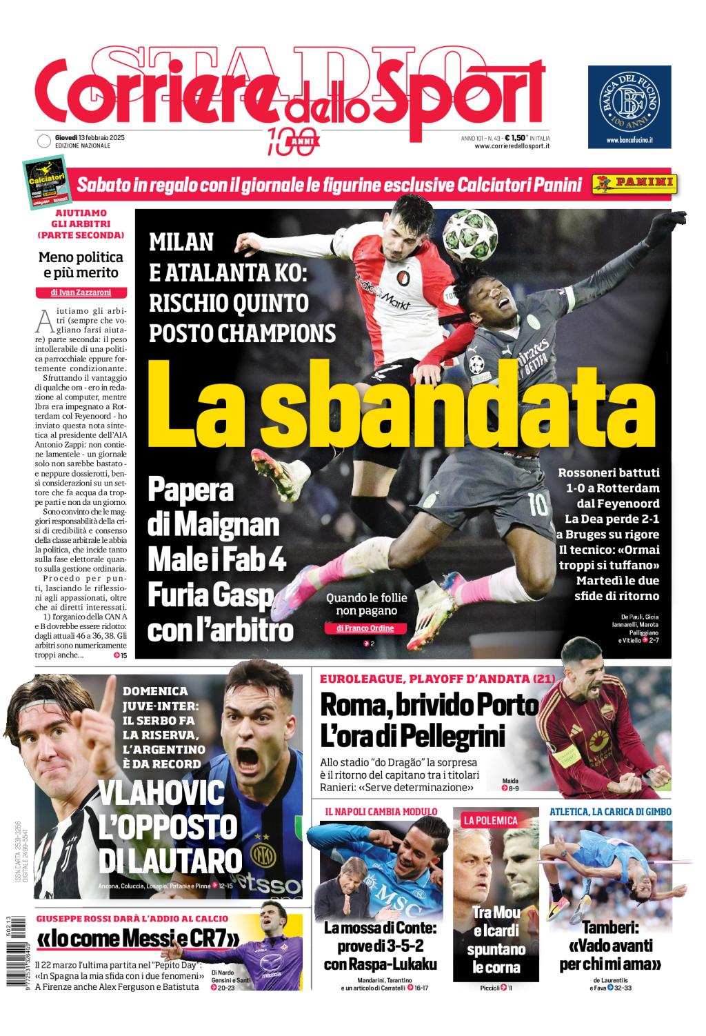 Questa è la prima pagina del 'Corriere dello Sport', in edicola oggi, giovedì 13 febbraio 2025. Diamo un’occhiata alle principali novità sul mondo dello sport e in particolare del calcio, cercando di evidenziare le notizie sul Milan.