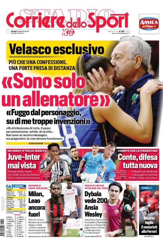 Questa è la prima pagina di 'Corriere dello Sport', in edicola oggi, giovedì 11 settembre 2025. Diamo un’occhiata alle principali novità sul mondo dello sport e in particolare del calcio, cercando di evidenziare le notizie sul Milan.