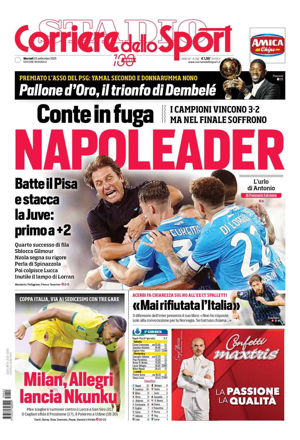 Sotto la testata si parla di Ousmane Dembélé, vincitore del Pallone d'Oro 2025 davanti a Lamine Yamal: nono Gianluigi Donnarumma, che ha però vinto il premio come miglior portiere. Quindi, le dichiarazioni di Francesco Acerbi, centrale difensivo dell'Inter, che ha spiegato come abbia rifiutato la convocazione nella Nazionale Italiana solo una volta con Luciano Spalletti e di essere pronto a rispondere ad un'eventuale chiamata del nuovo Commissario Tecnico, Gennaro Gattuso.