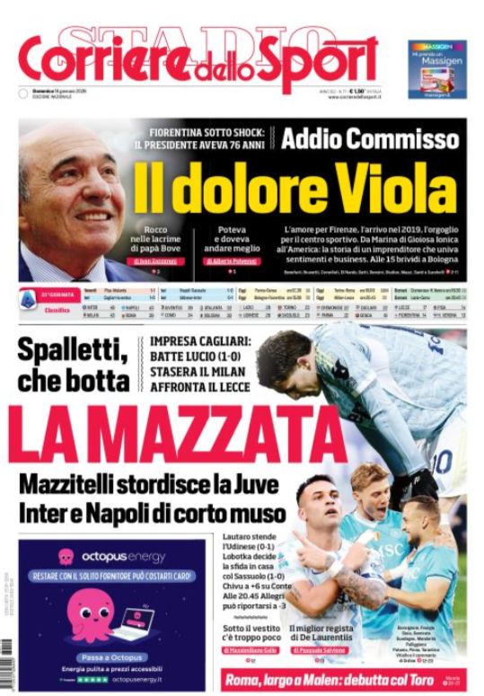 Questa è la prima pagina di 'Corriere dello Sport', in edicola oggi, domenica 18 gennaio 2026. Diamo un’occhiata alle principali novità sul mondo dello sport e in particolare del calcio, cercando di evidenziare le notizie sul Milan.