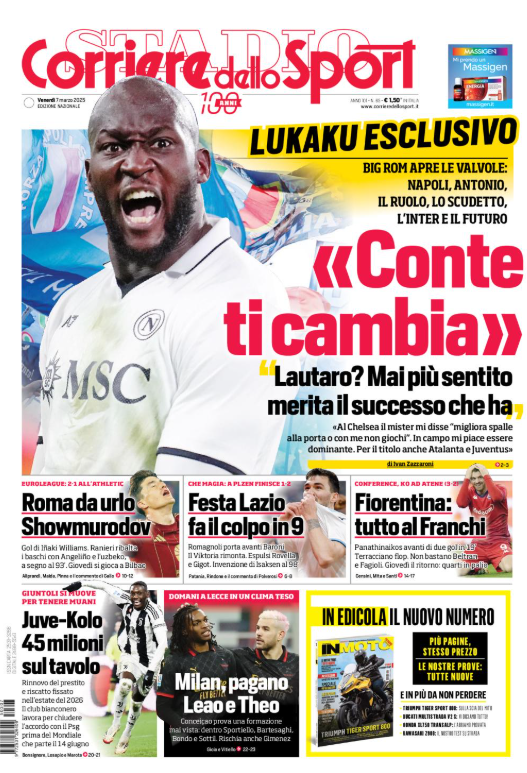 Questa è la prima pagina del 'Corriere dello Sport', in edicola oggi, venerdì 7 marzo 2025. Diamo un’occhiata alle principali novità sul mondo dello sport e in particolare del calcio, cercando di evidenziare le notizie sul Milan.