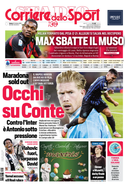 Questa è la prima pagina di 'Corriere dello Sport', in edicola oggi, sabato 25 ottobre 2025. Diamo un’occhiata alle principali novità sul mondo dello sport e in particolare del calcio, cercando di evidenziare le notizie sul Milan.