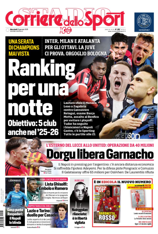 La prima pagina del 'Corriere dello Sport' apre con la Champions League. Inter, Milan e Atalanta agli ottavi. La Juventus ci prova. Orgoglio Bologna. Ranking per una notte. Napoli, Dorgu libera Garnacho. Roma, nella lista di Ghisolfi Embolo e Romero. Gasperini punta Raspadori. Lazio e Torino, duello per Casadei. Ecco la prima pagina del 'Corriere dello Sport'.