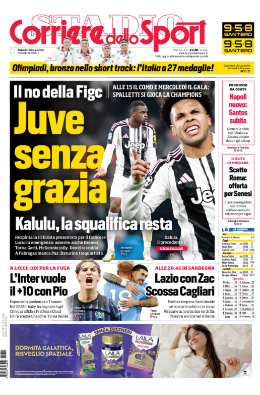 La prima pagina del 'Corriere dello Sport' apre con la Juve: Kalulu senza grazia. No della Figc. Napoli nuovo: Santos subito. Scatto Roma: offerta per Senesi. L'Inter vuole il +10 con Pio Esposito. Lazio con Zaccagni. Ecco la prima pagina del 'Corriere dello Sport'.