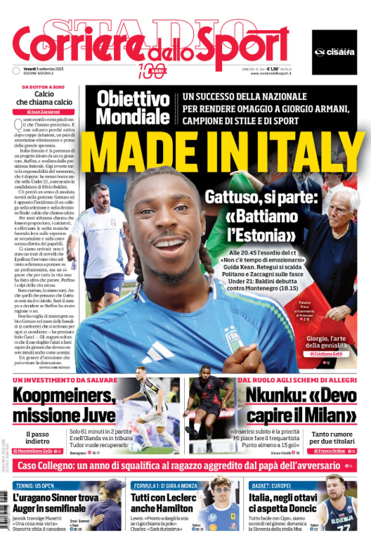 Questa è la prima pagina di 'Corriere dello Sport', in edicola oggi, venerdì 5 settembre 2025. Diamo un’occhiata alle principali novità sul mondo dello sport e in particolare del calcio, cercando di evidenziare le notizie sul Milan.