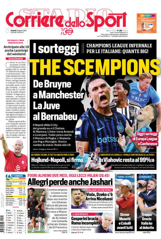 La prima pagina del 'Corriere dello Sport' apre con i sorteggi di Champions League. Hojlund-Napoli si firma. Vlahovic resta al 99%. Dzeko c'è, Fiorentina arriva Nicolussi. Gasperini brucia, Roma incompleta. Oggi Lecce-Milan, Allegri perde Jashari: fuori almeno due mesi. Ecco la prima pagina del 'Corriere dello Sport'.