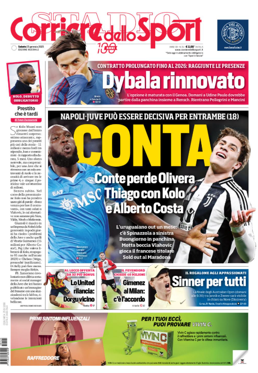 La prima pagina del 'Corriere dello Sport' apre con il Napoli-Juventus: Conta. Può essere decisiva per entrambe. Dybala rinnovato. Kolo Muani al debutto. Lo United rilancia: Dorgu è vicino. Santiago Gimenez al Milan: c'è l'accordo. Sinner per tutti. Ecco la prima pagina del 'Corriere dello Sport'.