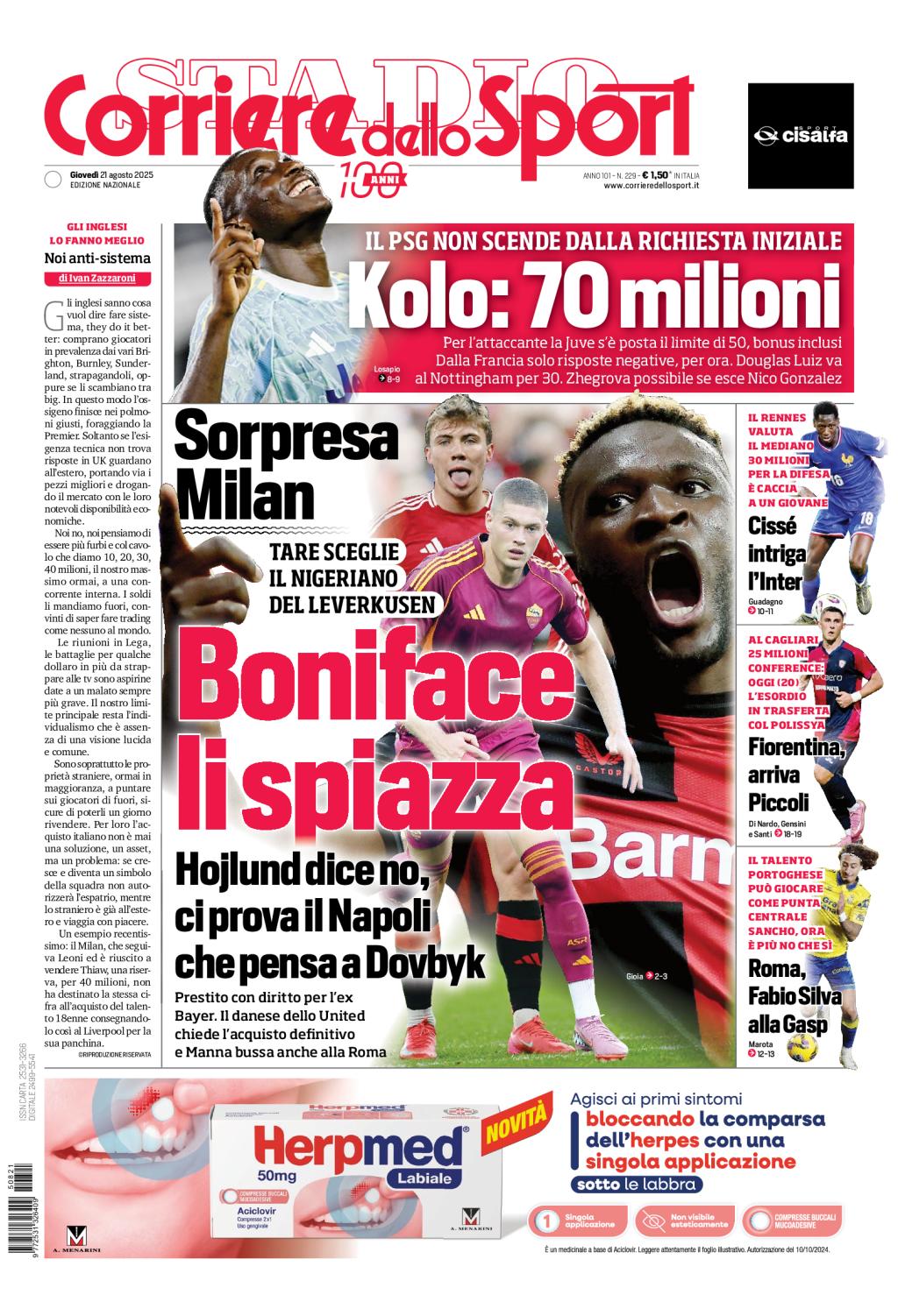 In alto, sotto la testata, le difficoltà della Juventus di arrivare a Randal Kolo Muani, perché il PSG non scende dalla richiesta iniziale di 70 milioni di euro. Il limite che si sono posti i bianconeri è di 50, bonus inclusi. Nel caso di cessione di Nico González, poi, la 'Vecchia Signora' accoglierà nelle proprie fila l'esterno offensivo Edon Zhegrova (Lille).